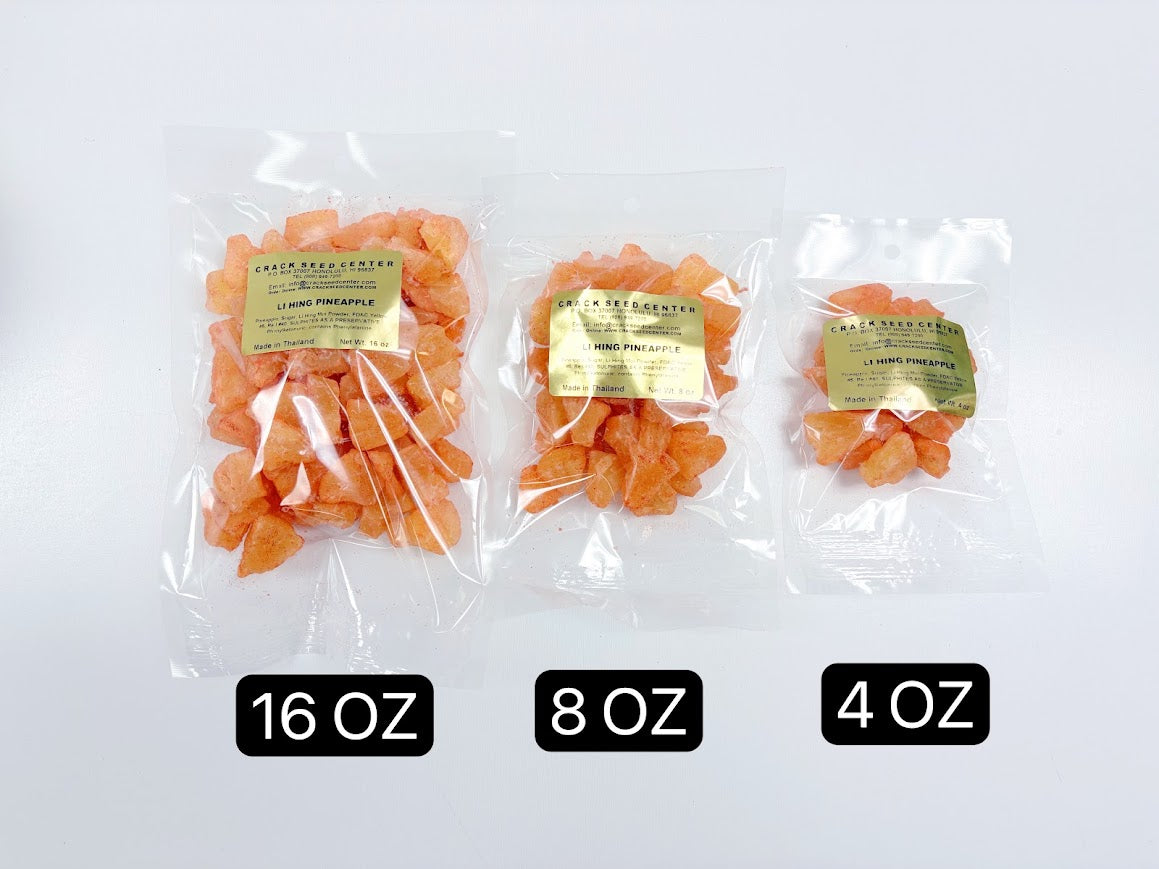 Li Hing Pineapple:Dried pineapple sprinkled with Li Hing Mui powder for a sweet, tangy, and savory Hawaii-style treat. Perfect for anyone who loves bold tropical flavors!